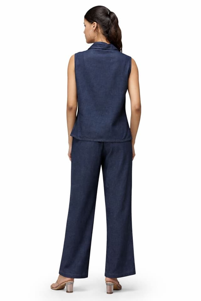 Upgrade your everyday wardrobe with this premium denim cotton co-ord set for women, designed to deliver effortless style with breathable comfort. Crafted from high-quality denim cotton fabric, this stylish women’s cord set offers a perfect balance of structure and softness—ideal for all-day wear. The sleeveless top features a smart shirt collar with front button closure, adding a polished and contemporary touch to your look. Paired with wide-leg pants, this co-ord set creates a flattering silhouette that enhances comfort and movement. The rich denim shade makes it a versatile outfit for casual outings, workwear, travel, and smart everyday styling. Whether styled with heels for a chic look or flats for a relaxed vibe, this trendy denim co-ord set is a must-have addition to your fashion collection.